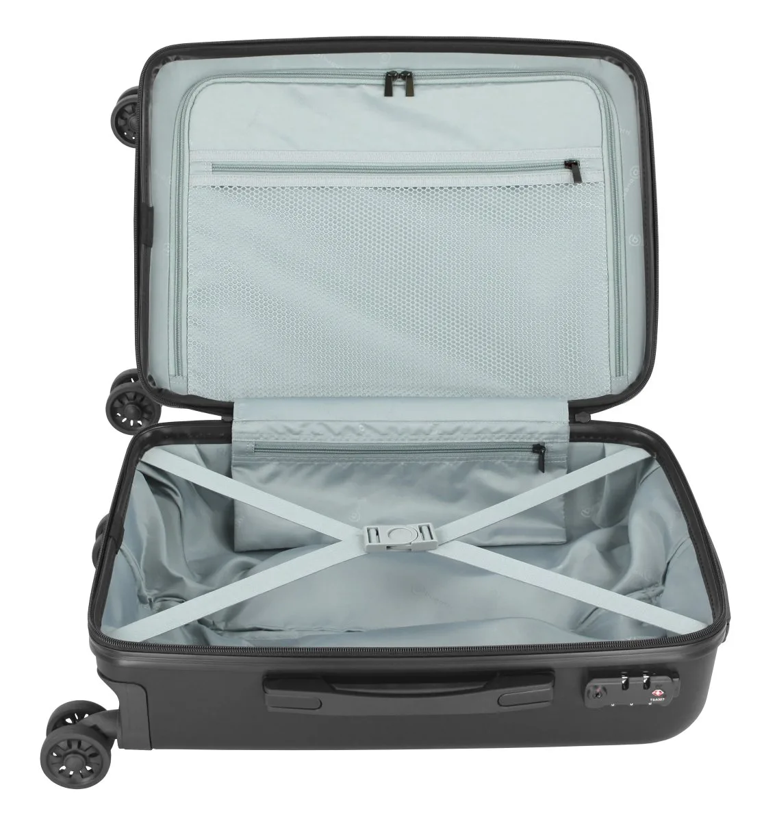 Dieser Trolley mit vier stabilen Rollen, Teleskopgriff, zwei gepolsterten Tragegriffen und TSA-Zahlenschloss bietet ein geräumiges Hauptfach mit Kreuzspanngurt und Reißverschlussfach sowie ein Hemdenfach und ein großes Netzfach. Die hochwertige Hartschale aus 40% ABS und 60% PC ist extrem robust, unempfindlich für Kratzer und rundet das Gesamtbild dieser tollen Koffer Serie ab.