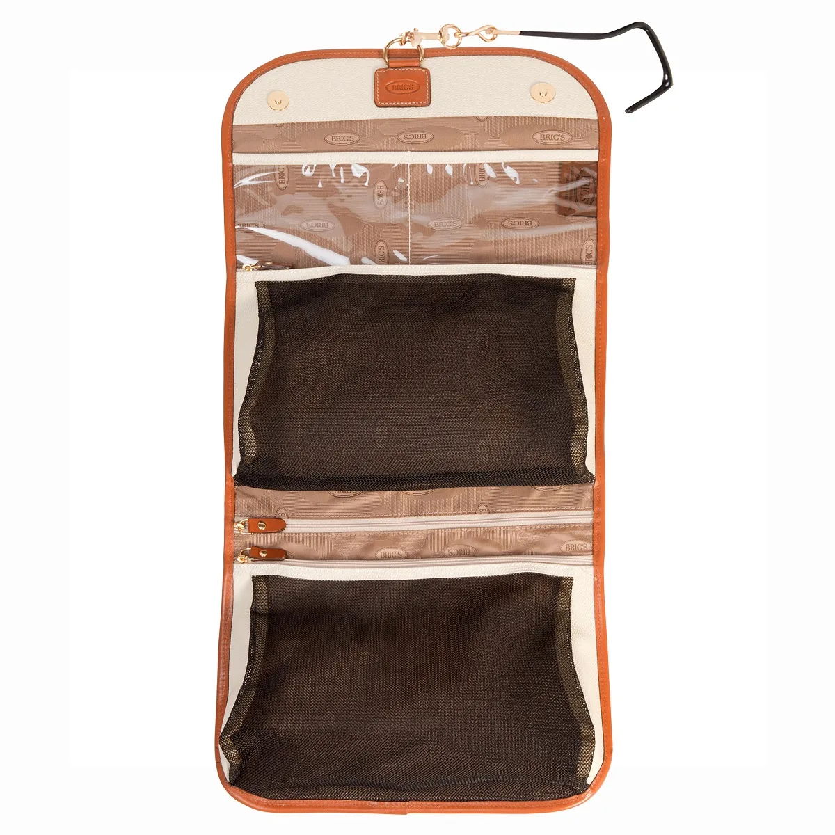 Beautycase tri-fold der Kollektion Firenze von Bric´s, hergestellt aus weichem Synthetikmaterial mit gaufrierter Oberfläche. Das ikonenhafte und elegante Design wird von edlen Besätzen aus pflanzlich gegerbtem Toskana-Leder vervollständigt. Diese Kulturtasche bewahrt alle Ihre Körperpflegeprodukte ordentlich an einem geräumigen und organisierten Platz auf.